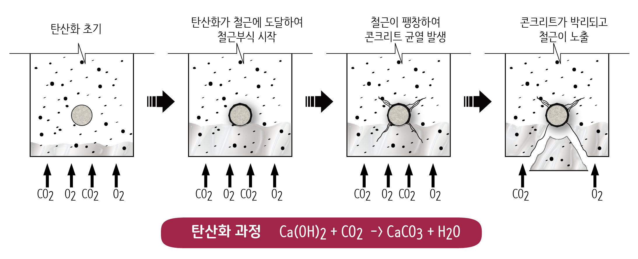 시멘트가 물과 반응하면 수산화칼슘(Ca(OH)₂)이 25% 정도 생성됩니다. 수산화칼슘은 강한 알칼리성을 띠고 철근이 부식되는 것을 막아줍니다. 그런데 콘크리트가 공기중의 이산화탄소(CO₂) 등과 접촉하면 수산화칼슘이 탄산칼슘으로 변하게 됩니다. 이 탄산화는 수산화칼슘이 없어지면서 알칼리성이 상실되는 것이라 중성화라고도 합니다.