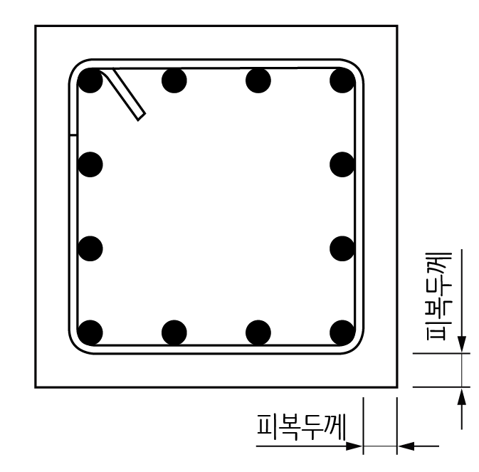 가장 바깥쪽에 있는 철근의 외면에서 콘크리트 외면까지의 두께를 피복두께(Cover)라고 합니다. 피복두께는 주근에서 재는 것이 아니라 가장 바깥쪽에 있는 띠철근(Tie-bar)이나 스터럽(Stirrup)에서 재야합니다.